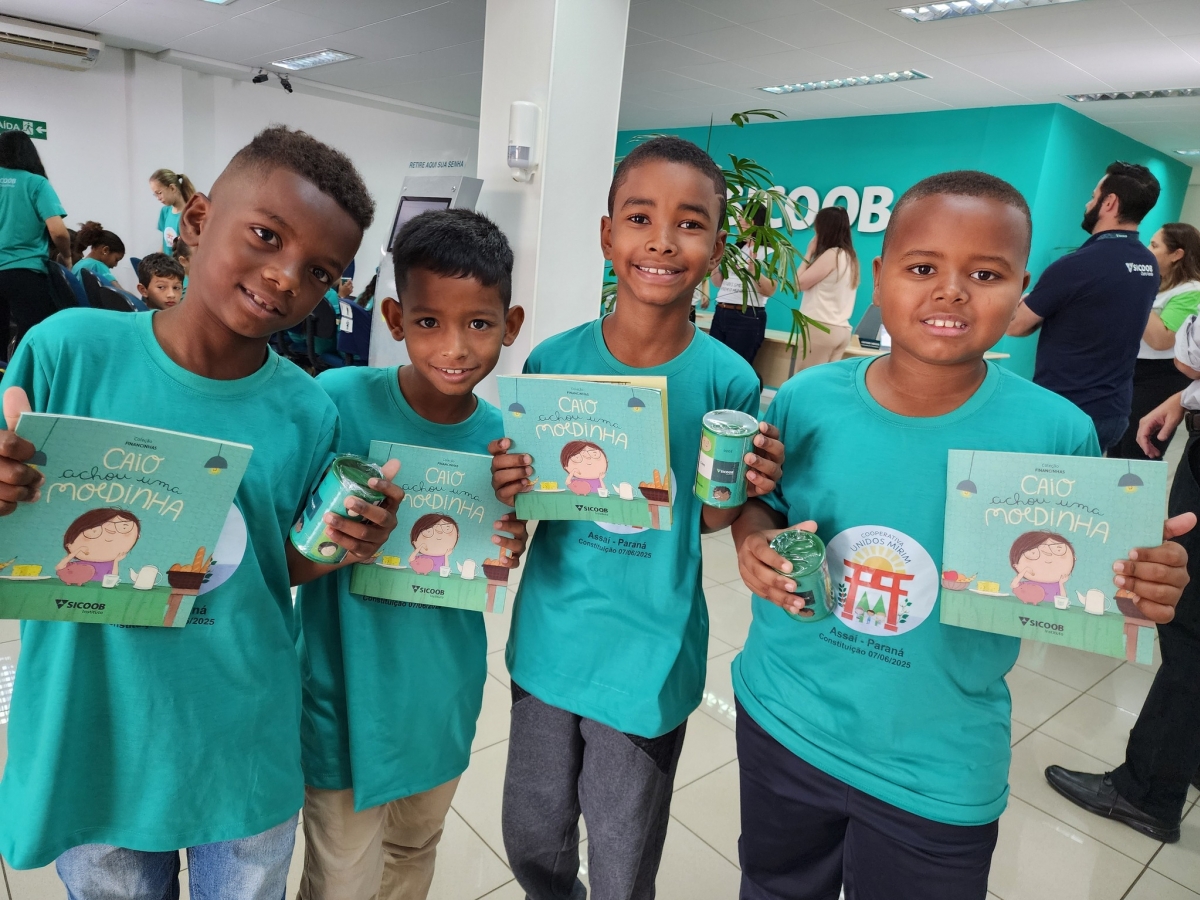 Para tornar o momento ainda mais especial, cada criança recebeu um exemplar do livro da historinha e um cofrinho, incentivando o hábito da economia e o aprendizado sobre finanças desde cedo.