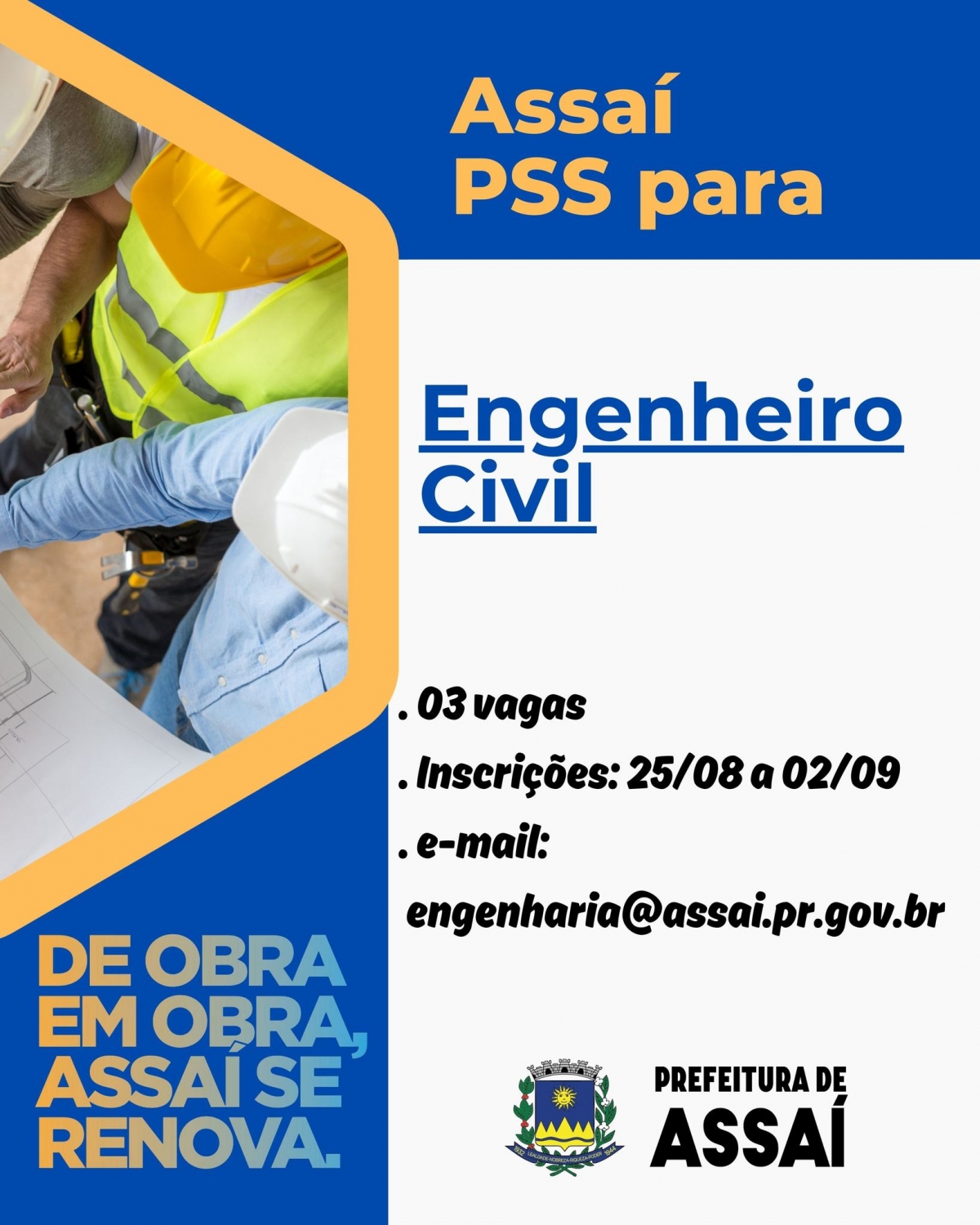 A Prefeitura Municipal de Assaí anuncia a abertura do Processo Seletivo Simplificado (PSS) nº 03/2025 para a contratação temporária de Engenheiros Civis.