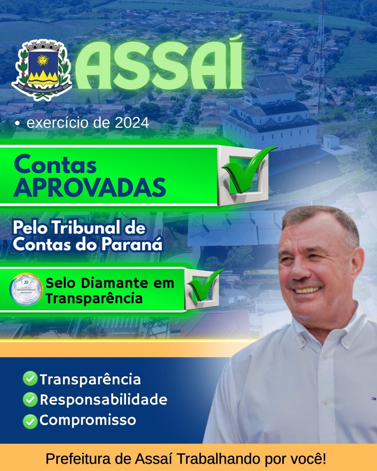 Reafirmando o compromisso com a responsabilidade e a transparência, a Prefeitura de Assaí recebeu mais uma excelente notícia: as contas do exercício de 2024 foram aprovadas sem ressalvas pelo Tribunal de Contas do Estado do Paraná (TCE-PR). Além disso, o município garantiu novamente o Selo Diamante em Transparência, o mais alto reconhecimento concedido às gestões públicas que se destacam pela clareza e acessibilidade das informações.