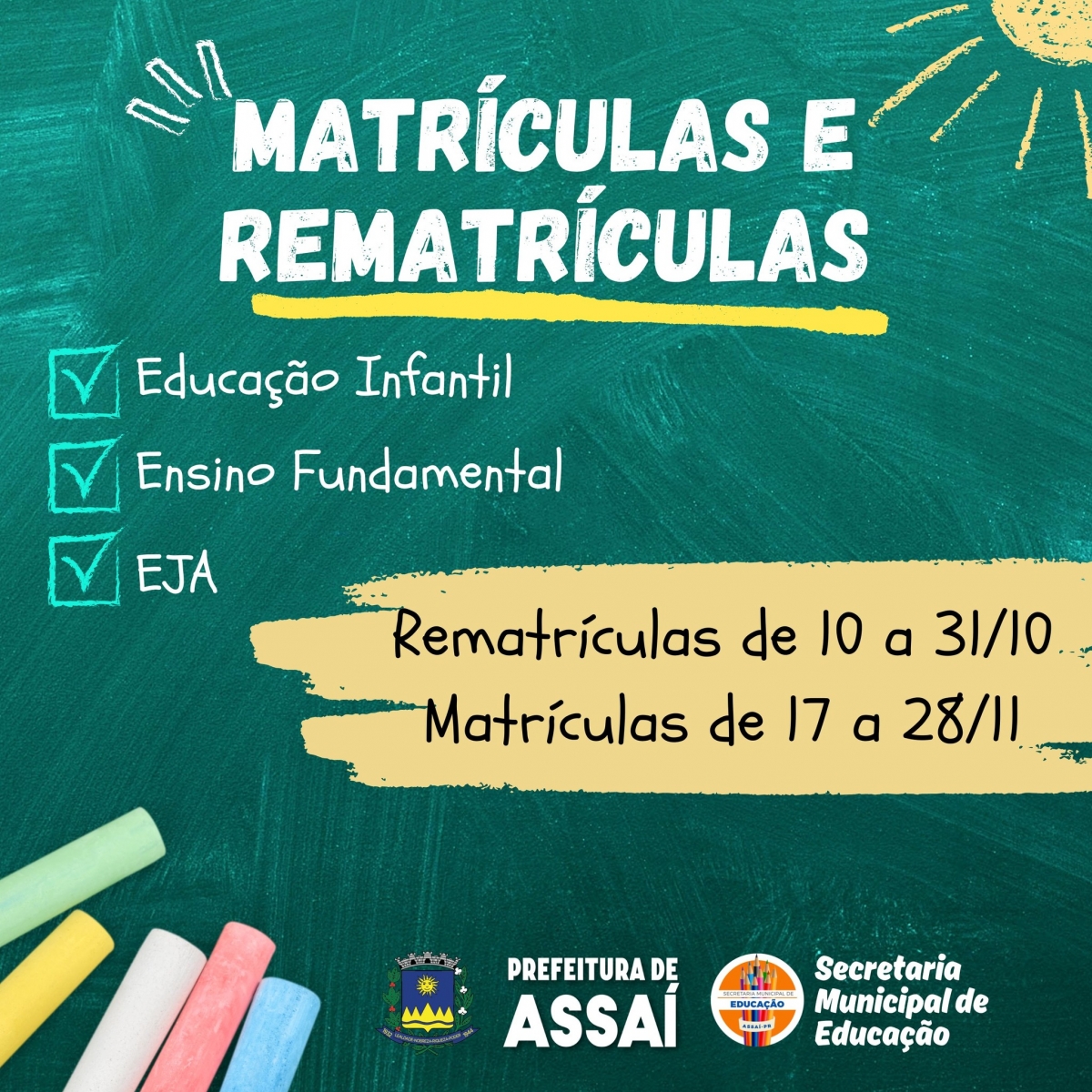 ATENÇÃO PARA AS DATAS DE MATRÍCULAS E REMATRÍCULAS ESCOLARES NA REDE MUNICIPAL DE EDUCAÇÃO DE ASSAÍ