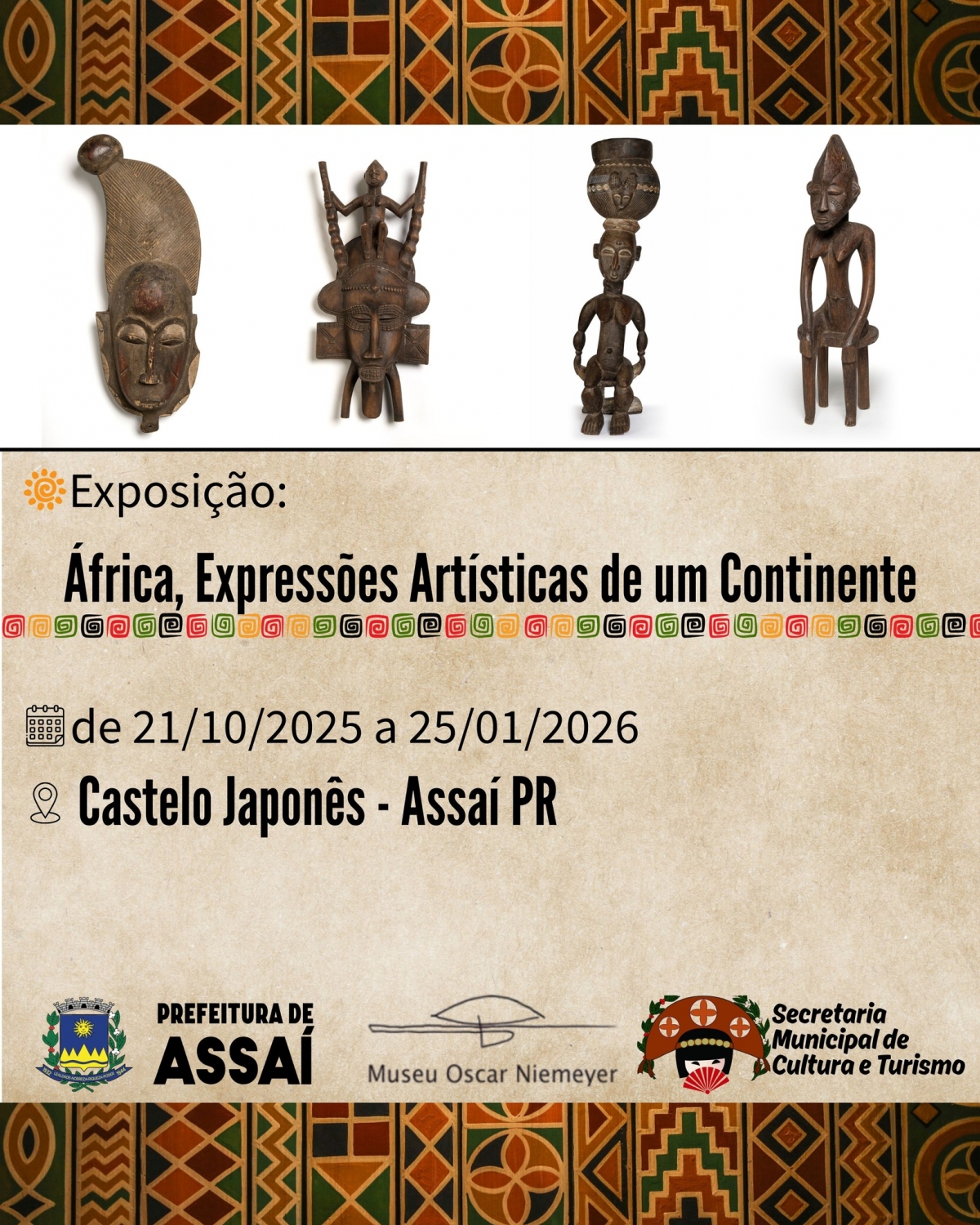 De 21 de outubro a 25 de janeiro de 2026, o Memorial da Imigração Japonesa de Assaí – Castelo Japonês abre as portas da a exposição “África, Expressões Artísticas de um Continente”, promovida pelo Museu Oscar Niemeyer (MON).