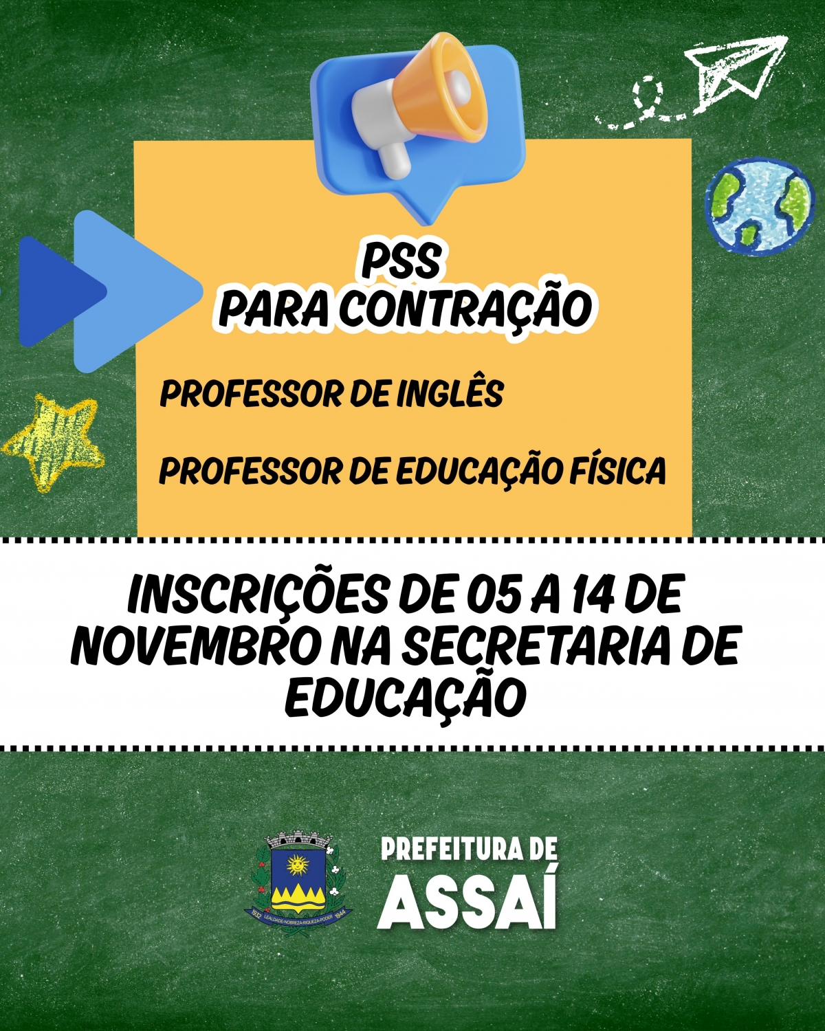 A Prefeitura Municipal de Assaí, por meio da Secretaria Municipal de Educação, informa que serão abertas as inscrições para o Processo Seletivo Simplificado (PSS) destinado à contratação temporária de professores para a Rede Municipal de Ensino, com convocação para o ano letivo de 2026.