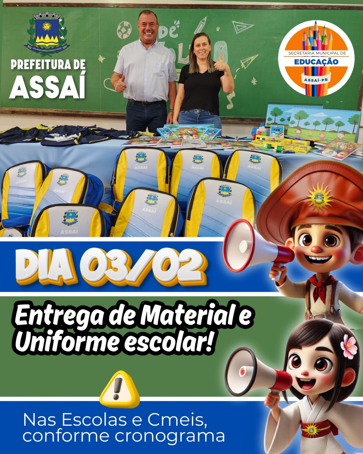 A Prefeitura de Assaí tem a alegria de anunciar a entrega dos kits de material e uniformes escolares para os alunos da rede municipal de ensino e da APAE. A ação acontece antes do início das aulas, reforçando o compromisso Do Prefeito Tuti Bomtempo com a educação, a igualdade e o cuidado com as famílias assaienses.