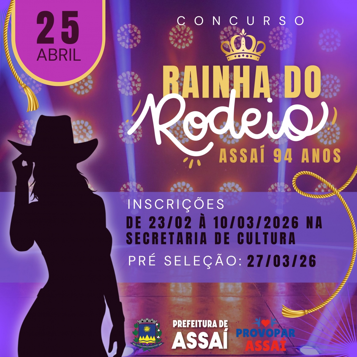 A Prefeitura de Assaí, por meio da Secretaria de Cultura e Turismo, abre as inscrições para o Concurso Rainha do Rodeio Assaí – 94 anos, uma das grandes atrações das festividades de aniversário da cidade!