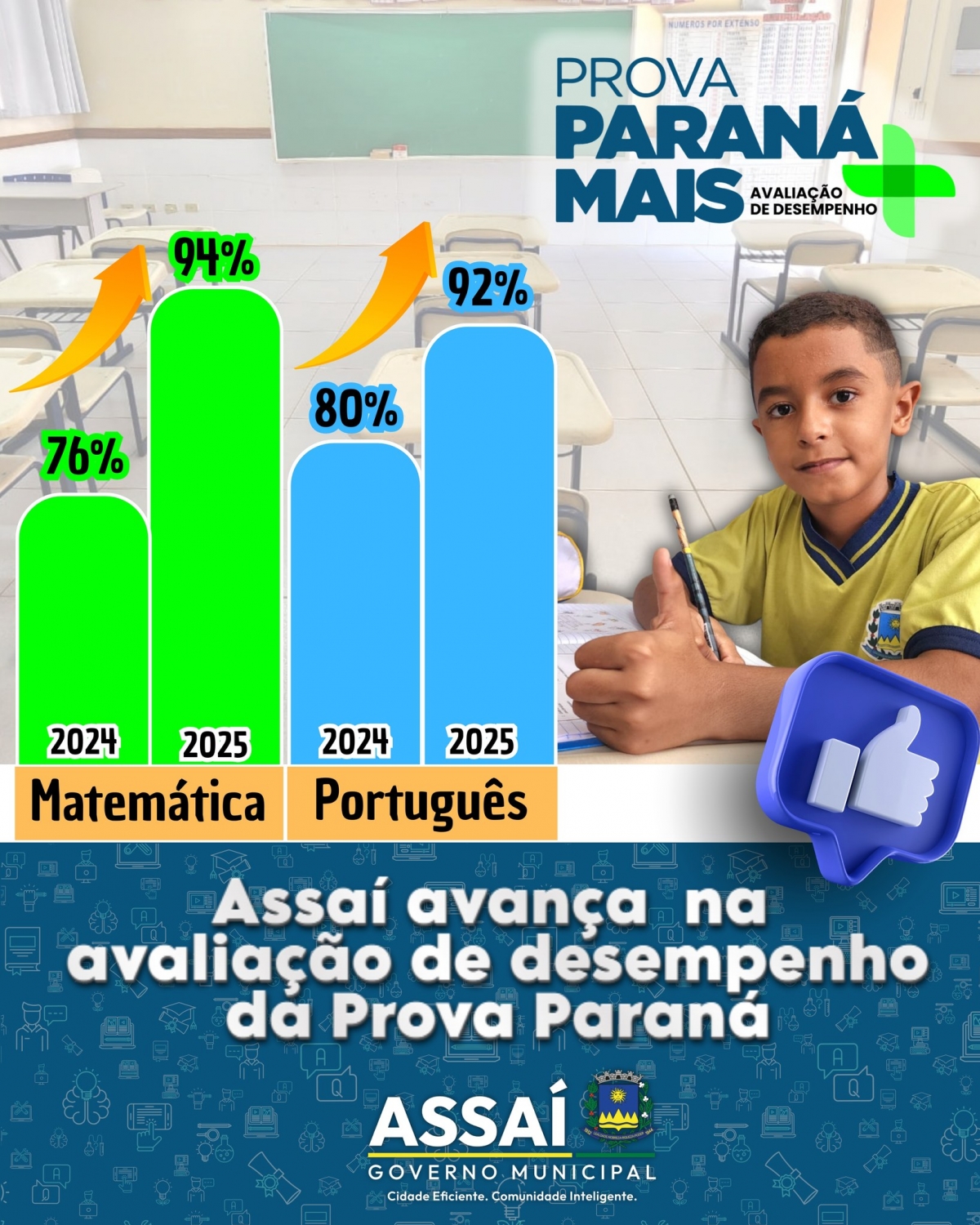 A educação de Assaí segue conquistando resultados que enchem a cidade de orgulho. Com investimentos contínuos e um trabalho comprometido dentro das salas de aula, o município avança de forma significativa na Avaliação de Desempenho da Prova Paraná Mais, reforçando seu destaque na alfabetização na idade certa.